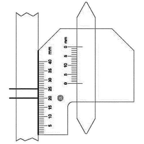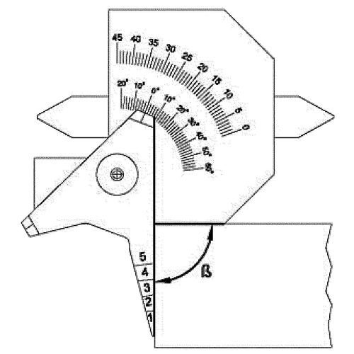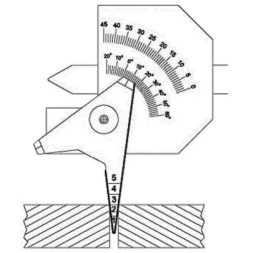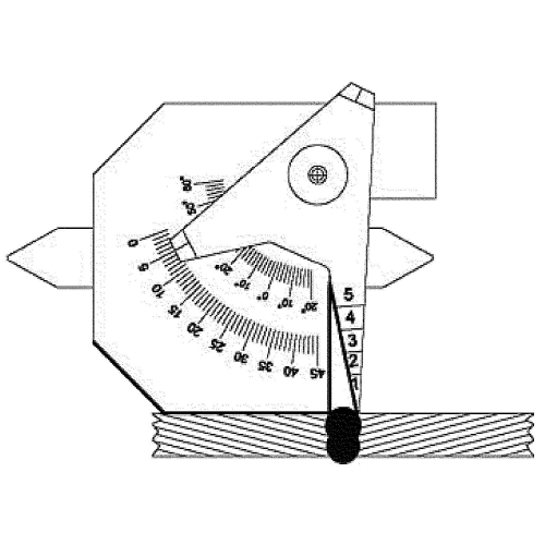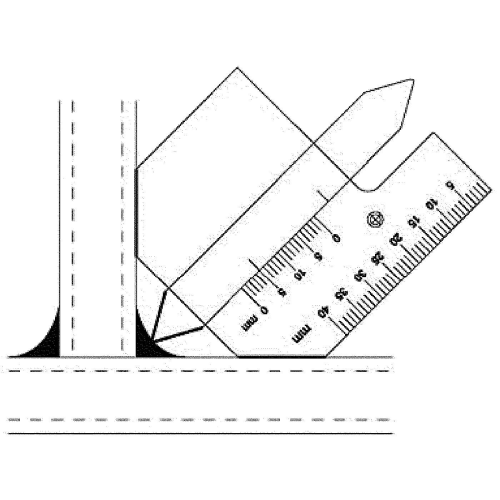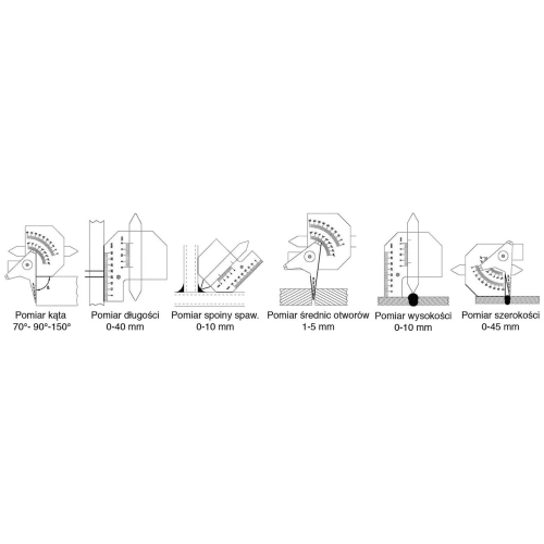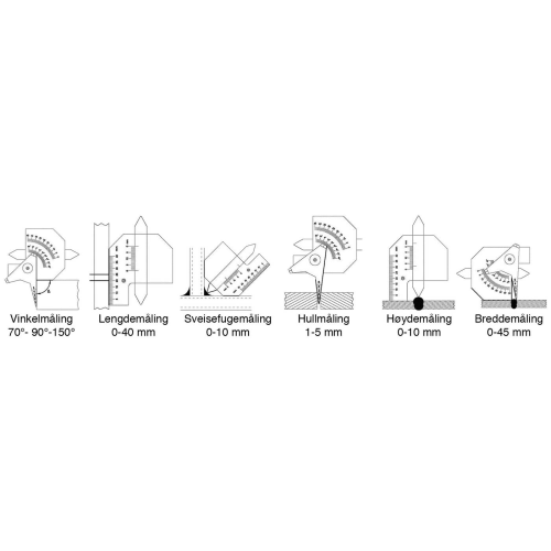 Mäter svetsfog i hörn. Svetsfoghöjd på plana svetsar. Höjd/materialtjocklek. Vinkelmätning. Distans mellan plåtar. Håldiameter.