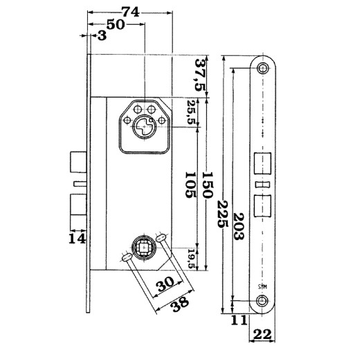 Funktion: Cylinder-, förreglings- och tryckesfall dras in med nyckel eller vred. Tryckesfallen dras in med trycke. Automatisk förregling av cylinderfallet vid 14 mm utlåsning och intryckt förreglingsfall.